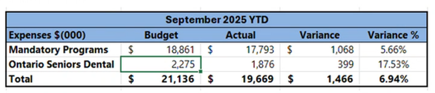 For the Ontario Seniors Dental program, there is a $398K underspend as of September 30, 2025. This is also due to salaries and benefits. There have been a number of vacancies in this particular program. Clinical supplies are under budget. The usage was not at the levels we anticipated. Purchased services is related to contracts with outside dental offices. We are also outsourcing clients for dentures. There are three different arrangements for denturists to assist with a long wait list for dentures.